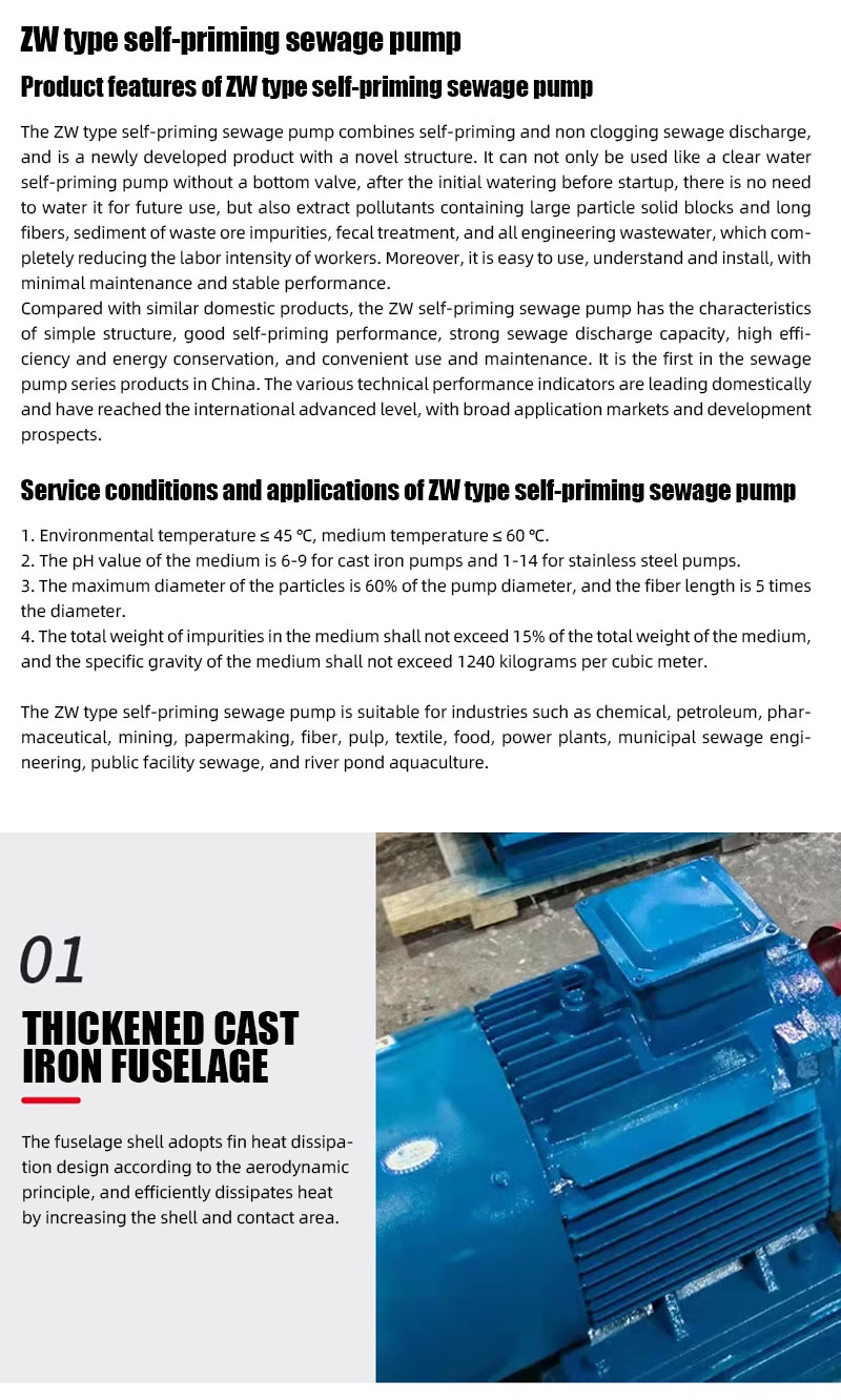 ZW type self-priming sewage pump has the characteristics of simple structure, good self-priming performance, strong sewage