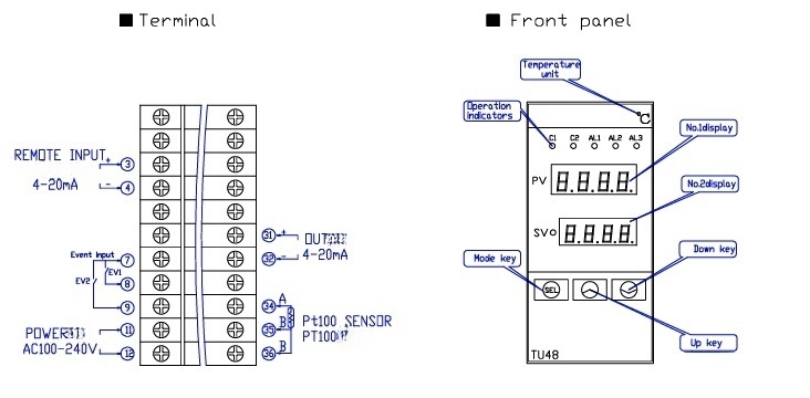 | Remote input | 4-20mA DC input (used in conjunction with 250Ω) 4mA corresponds to a set temperature SV = 65℃ 20mA corresponds to a set temperature SV = 95℃ |
